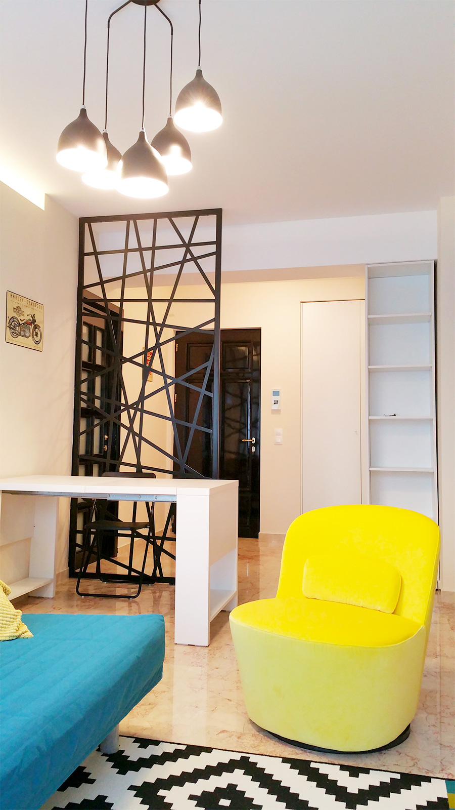 Acest apartament a fost amenajat pentru a fi închiriat. În acest sens, amenajarea trebuia să fie versatilă pe toate planurile, bifând la capitolele: culoare, stil, funcționalitate, buget, în sensul conceptului ”easy to rent”; și așa a și fost.