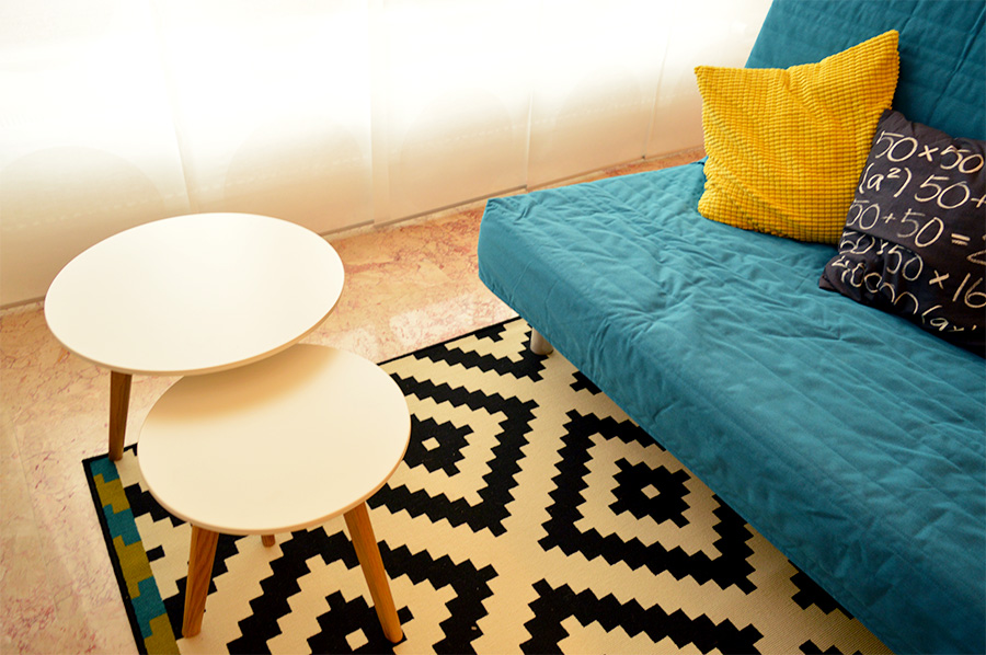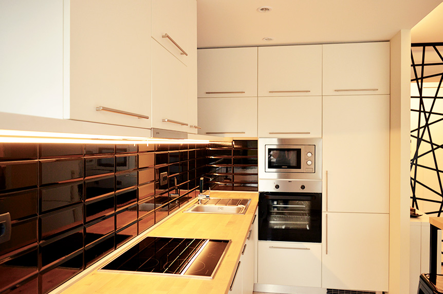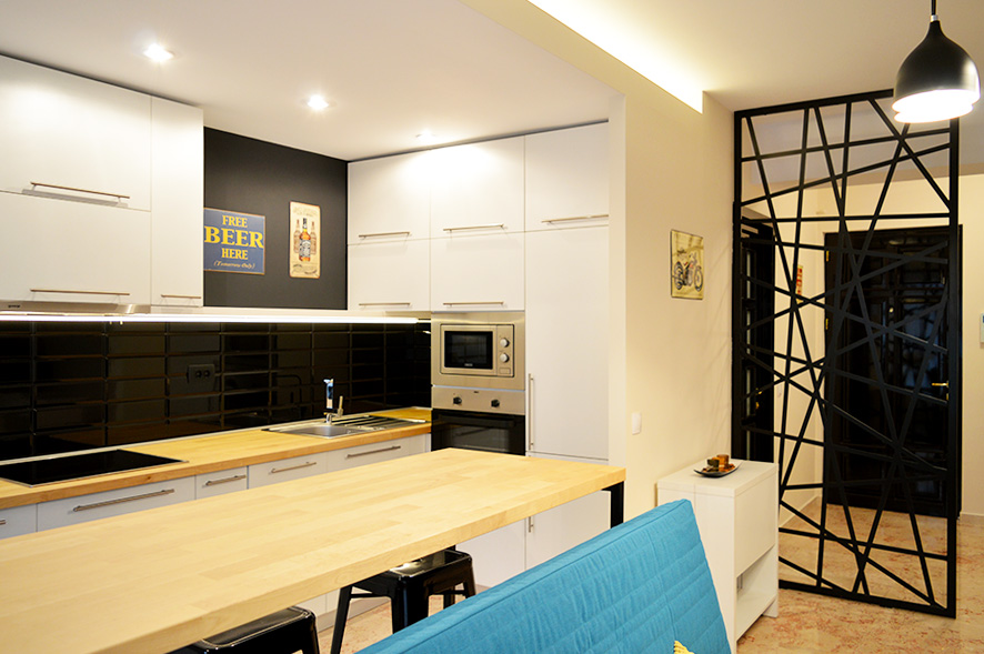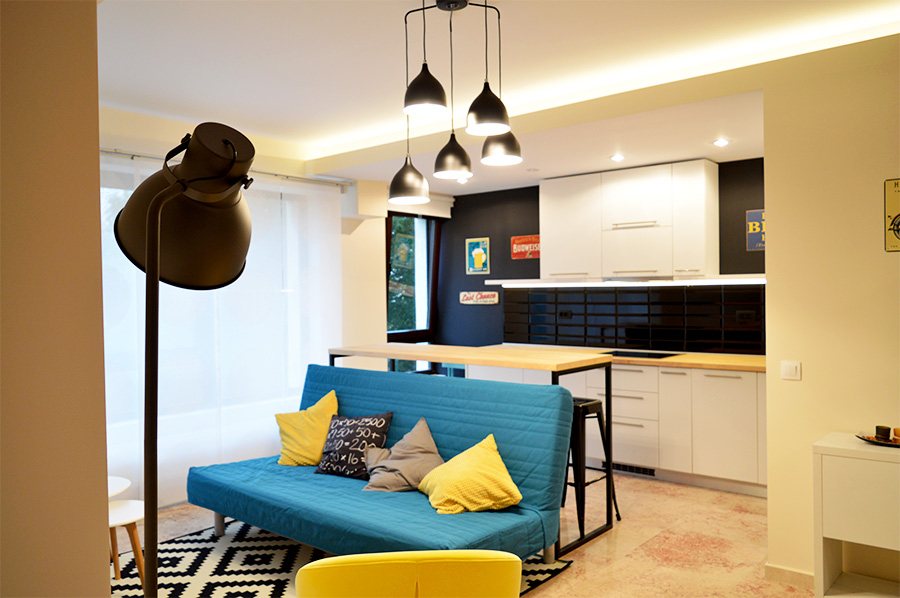 Zona de gătit se transformă insesizabil în zonă de zi prin intermediul unui loc de luat masa înalt, cu fier și lemn natur, asemeni unui ”bistro” contemporan. În așa fel spațiul se potrivește aproape oricărei persoane și stil de viață. Culoarea albă pentru pereți și pentru piesele de mobilier crează fond neutru și contrast pentru a înveseli camerele cu intervenții minore: o canapea turcoaz, câteva perne galbene, faianță neagră tip ”subway” din zona de gătit și panoul decorativ din metal care distinge holul de restul camerelor. Dormitoarele urmăresc același principiu al contrastelor, cu obiecte, corpuri și materiale textile din comerț drăguțe și colorate și se pretează atât somnului cât și lucratului la un birou sau cititului.